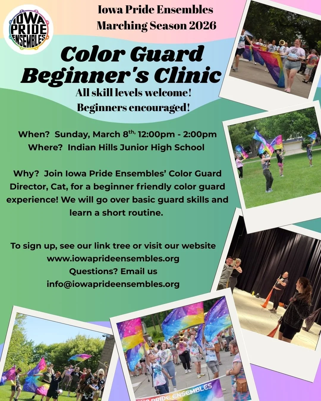 Iowa Pride Ensembles is for everyone, even if you don’t have prior musical experience. Color guard is a great way to get involved in our growing community. Whether you are a color guard aficionado or you’ve never picked up a flag, join us for our free workshop! We will